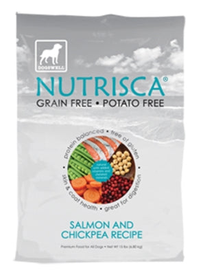 NUTRISCA Salmon & Chickpea Recipe is made with simple, real food ingredients. Thoughtfully crafted with real salmon as the number one ingredient, Nutrisca Salmon & Chickpea recipe is balanced with peas, chickpeas and real fruits and vegetables. It's formulated with antioxidant nutrients and omega fatty acids to help support your dog's health and well-being. Every recipe is free of grains, potatoes, corn, wheat, soy, artificial colors, artificial flavors and artificial preservatives.Key Benefits