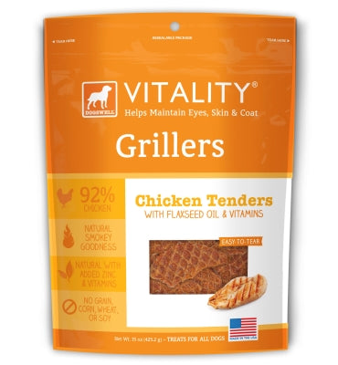 Who says the dog days of summer have to come to an end? With the tender, smoky goodness of Vitality Grillers, your dog gets a pass at the grill all year round. Made with delicious, 100% USA-sourced chicken, Grillers taste great and are made with added flaxseeed, vitamins and mineral supplements. Here's to chasing an endless summer!Key Benefits