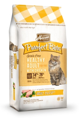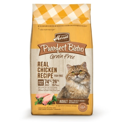 Cats thrive on a grain-free diet high in quality protein with moderate fat levels and low levels of carbohydrates. That's why Purrfect Bistro Grain-Free Real Chicken Recipe Cat Food provides balanced nutrition using real whole foods sourced from local farmers. This natural, 100% grain-free formula cat food is ideal for adult cats 1 - 7 years old with a focus on nutrient rich ingredients to support overall health. Deboned chicken is the first ingredient and, along with chicken and turkey meals, helps comprise the 74% protein level of meat sourced ingredients that are highly digestible and rich in essential fatty acids. Fresh produce like sweet potatoes and peas provide easily digestible carbohydrates that offer the benefit of sustained energy without upsetting grain-sensitive digestive systems. This high quality grain-free diet is fortified with vitamins, minerals, probiotics, and antioxidants. Not all brands make their own food. Merrick puts cooking and quality under one roof. Their five-star kitchen and manufacturing facilities uphold the strict guidelines well defined by the FDA. All of Merrick recipes source farm fresh ingredients locally to ensure the highest quality. As a result, their recipes are 100% free of ingredients from China.Key Benefits