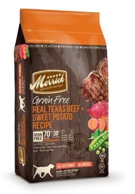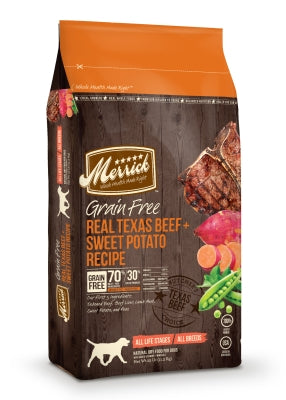 Dogs thrive on quality protein and healthy fats, which is why Merrick Grain-Free Real Texas Beef & Sweet Potato Dry Dog Food provides balanced nutrition with real whole foods sourced from local farmers. This natural, grain-free formula dog food is ideal for all life stages and all breeds of dogs with a focus on naturally nutrient rich ingredients to support overall health. Deboned real Texas Beef is the first ingredient and helps comprise the 70% of meat sourced ingredients that help build and maintain lean, healthy muscle tissue with high quality protein, support healthy skin and coat with omega fatty acids and support joint health with glucosamine. The 30% fresh produce fortifies this high-quality grain-free canine diet with sweet potatoes, potato, peas, apples and blueberries offering vitamins, minerals and antioxidants. Easily digestible carbohydrates like potatoes and sweet potatoes offer the benefit of sustained energy without upsetting grain-sensitive systems. This food revolution yields 38% protein in every bowl. Merrick locally sources their farm fresh ingredients to ensure the highest quality.Like with all of Merrick’s recipes, this recipe doesn’t contain any ingredients from China and are cooked in Merrick’s own five-star kitchen and manufacturing facilities that uphold the strict guidelines well defined by the FDA.Key Benefits