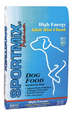 SPORTMiX High Energy Adult Mini Chunk 26/18 is formulated for adult dogs who require extra protein and fat in their diet due to their level of activity or living environment. SPORTMiX High Energy Adult Mini Chunk is formulated with supplemental flaxseed which helps ensure an improved Omega-6/Omega-3 fatty acid balance, promoting healthy skin and coat. This great formula is available in two kibble sizes, Chunk and Mini Chunk.Key Benefits